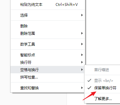 (6)需要注意的是,一定要勾选,菜单栏中编辑->空格与换行->保留单独的换行符,如下图所示,这样才能使用Shift+Enter键的方式另起一行,如果不勾选,只能用<br/>或<br/>的方式另起一行。