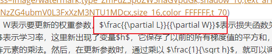 这是一个hexo中的latex公式渲染问题。不能在公式内连续使用两个左花括号!,把两个左花括号中间加空格分开就行了,即改为:$\frac{ {\partial L} }{ {\partial W} }$