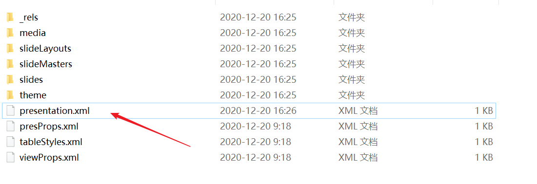 2、解压缩后,打开文件夹,进入ppt文件夹下并打开presentation.xml文件,如下图: