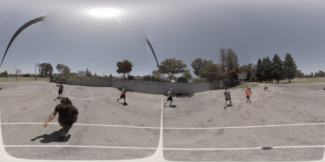 (3)ERP全称equirectangular projection,又可以称为equidistant cylindrical projection,中文译为等距柱状投影。这种投影方式将经线映射为恒定间距的垂直线,将纬线映射为恒定间距的水平线,映射关系相对简单,但既不是等面积的也不是保角的,引入了相当大的失真。下图是一幅用ERP方式投影的360全景图,长宽比为2:1,可以明显看出,两极区域拉伸严重,造成了极大的冗余,增加了编码负担。