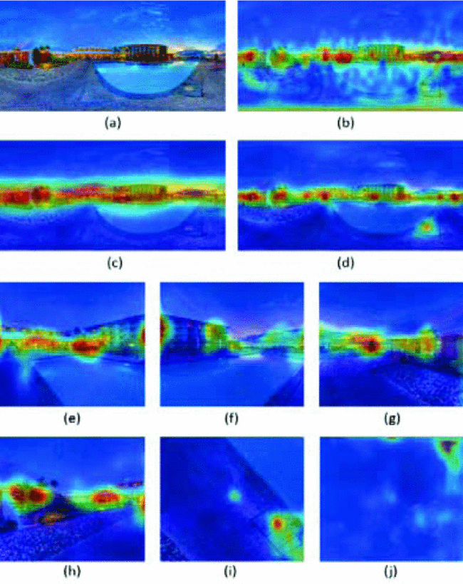 图1:(a)ERP图像,(b)ground truth显著图,©(d)分别是全局和局部的显著图,(e)-(j)通过立方体投影的直线显著图。