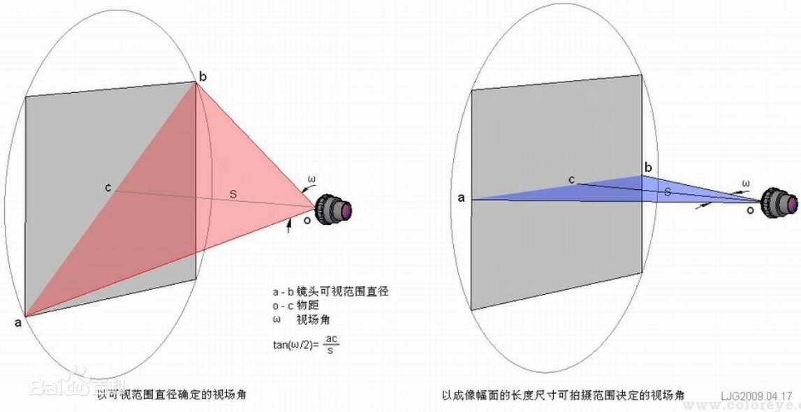 (5)视场角(FOV)。在光学仪器中,以光学仪器的镜头为顶点,以被测目标的物像可通过镜头的最大范围的两条边缘构成的夹角,称为视场角。如下图。 视场角的大小决定了光学仪器的视野范围,视场角越大,视野就越大。通俗地说,目标物体超过这个角就不会被收在镜头里,就只能看到局部物体。