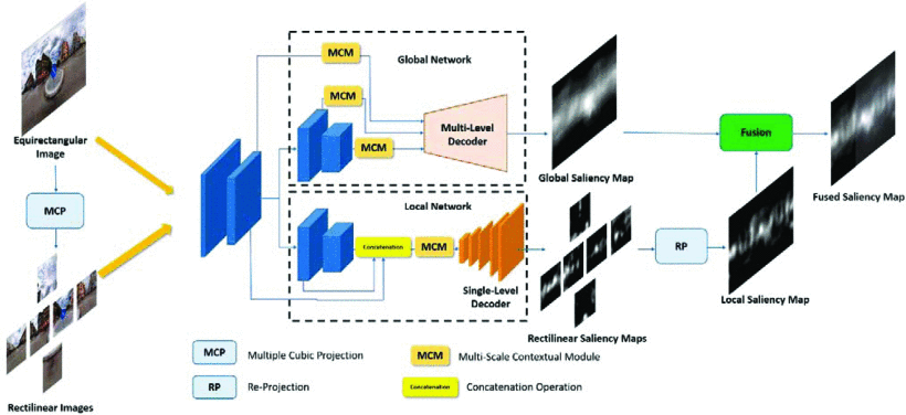 - 本文提出了一种全新的二叉式深度网络,该网络有两个子网络,分别预测360°全景图的全局和局部显著性特征,通过线性组合将全局显著图和局部显著图融合生成最终的显著图。