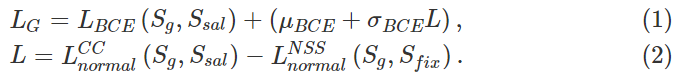 在使用SALICON预训练模型后,将全局和局部深度子网络进行联合微调。做法是将训练的直线图像分别放入模型中,相应地同时生成两个预测的直线显著图,一个是来自全局子网络,另一个是来自局部子网络。在360°全景图显著性预测模型中,经常使用皮尔逊相关系数(Pearson’s Correlation Coefficient,简称CC) 和归一化扫描路径显著性(Normalized Scanpath Saliency,简称NSS)这两个指标来衡量模型的有效性。因此,在二元交叉熵中加入这两个指标来优化模型训练的过程。对于全局子网络,损失可以定义如下: