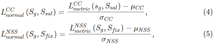 (8)Pearson’s Correlation Coefficient(CC)是指皮尔逊相关系数,用来评价预测的眼关注点显著图和ground truth之间的线性相关性,其值越大,相关性越强,算法性能越好,值为正表示正相关,值为负表示负相关。下面是其一个公式(CC有很多变种):