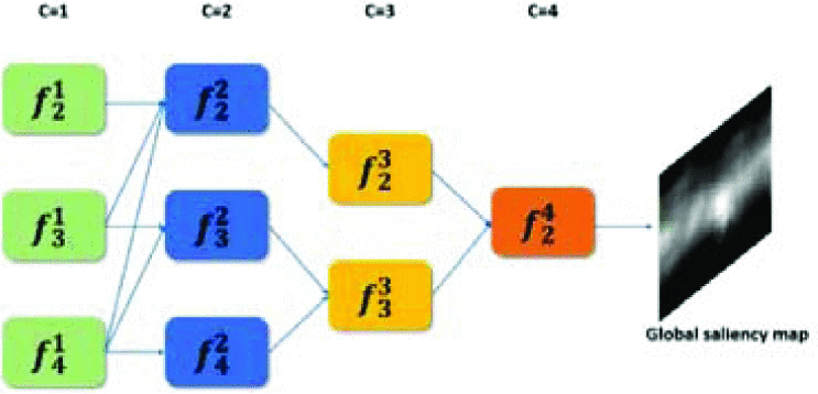 在全局子网络中,利用多尺度的上下文模块,得到三个判别性特征图{,i=2,3,4}。为了缩小这些特征之间的差距,采用多级解码器。如图5所示,在这个解码器中有四层(c=1,2,3,4),示 c 层中的第 i 个特征图,在第二层中更新了以下内容公式:
