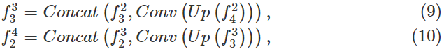 对于,作者设置 = ,对于,作者设置=(即这些位置的特征图采用一样的上采样和卷积操作)。至于 和 ,作者采用upsampling-convolution-concatenation策略来整合多个特征,公式如下: