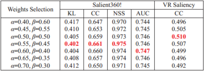 在融合全局与局部显著图时,我们做了多组全局和局部权重选择的实验。表1说明了在测试步骤中,两个数据集上不同权重的融合结果。可以看出,随着的增加( 减少),SalBiNet360的指标得分在两个数据集上都出现了先增加后减少的现象。当全局权重 设置为0.55时Salient360!表现最佳,在上设置为0.50时VR Saliency表现最佳。因此,在下面的实验中,我们在Salient360!上的融合策略中设置 =0.55(=0.45),在VR Saliency上设置 =0.50(=0.50)。