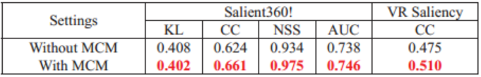 表2:SalBiNet360在两个数据集上有无上下文多尺度模块("MCM"表示多尺度上下文模块)的比较。