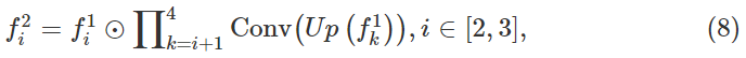 其中Up是对特征图进行因子为的上采样操作,Conv是3X3卷积层。 圈表示元素化的乘积(点积)。