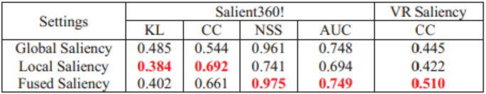 对于VR Saliency,根据其实验设置,用SALICON数据集预训练模型后直接测试22张360°全景图。同样,立方体也是每10°旋转一次,就会产生9x9x6x22=10692个直线图像。预测全局和局部的显著图和Salient360!中的一样。