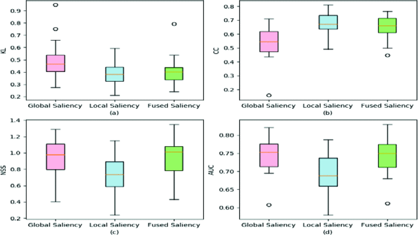 图7:全局、局部和融合显著性在VR Saliency上的得分分布对比