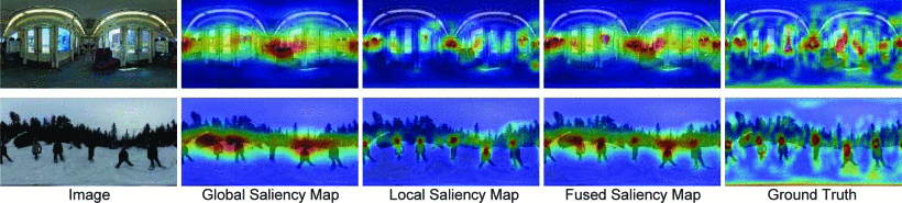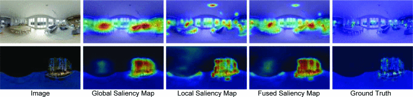 图8:Salient 360上的全局、局部、融合的显著图和ground truths 的视觉对比