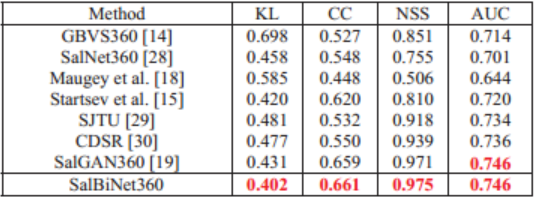 SalBiNet360的性能是通过四个常用的指标来评估的:KL、CC、NSS、AUC。KL和CC评价的是两个显著图之间的显著性密度分布(主要是面向局部信息的),NSS和AUC评价的是显著图和二元定点图之间的眼动位置分布(主要是面向全局信息的)。