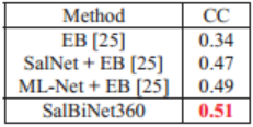 其中是CC的评价指标,是NSS的评价指标。、、、表示SalBiNet360对预测的二维图像计算的这两个指标(即CC和NSS)的平均值和标准差。