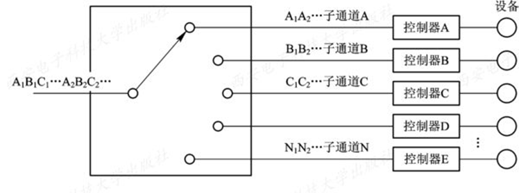 要做到及时接收多个用户键盘输入的命令,只需配置一个多路卡。多路卡的作用是,实现分时多路复用,以很快的速度周期性地扫描各个终端,接收各用户从终端上输入的数据。此外,为了能使从终端输入的数据被依次逐条地进行处理,还需要为每个终端配置一个缓冲区,用来暂存用户键入的命令(或数据)。