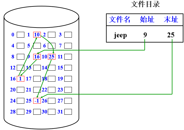 ②空闲盘区链:将磁盘上所有空闲盘区拉成一条链。和空闲表法类似。