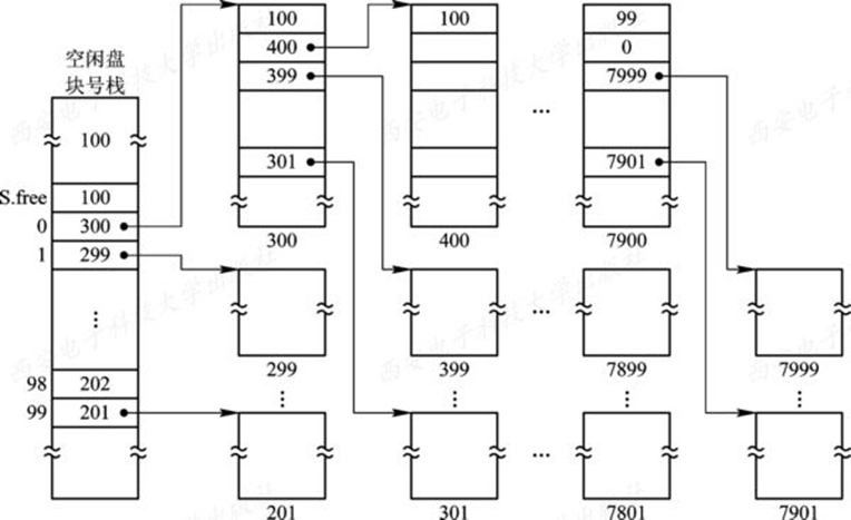 当栈中空闲盘块号数目已达100时,表示栈已满,便将现有栈中的100个盘块号记入新回收的盘块中,再将其盘块号作为新栈底。空闲盘块数记为1。