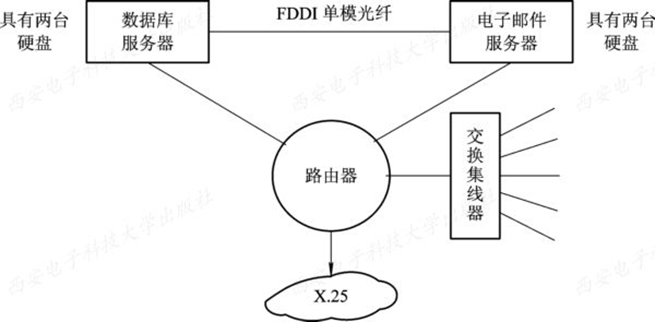 两台服务器均为在线服务器,它们各自完成自己的任务。例如,一台作为数据库服务器,另一台作为电子邮件服务器,为了实现两者互为备份的功能,在两台服务器之间,应通过某种专线将其连接起来。如果希望两台服务器之间能相距较远,最好利用FDDI单模光纤来连接两台服务器。在此情况下,最好再通过路由器将两台服务器互连起来,作为备份通信线路。下图是双机互为备份系统的情况: