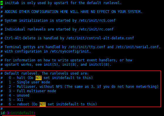 id:3:initdefault表示系统初始化的运行级别为3,一般常用的运行级别是3 和 5。如果要修改系统初始化的运行级别,那么只需修改 “id:” 后面的数字即可。