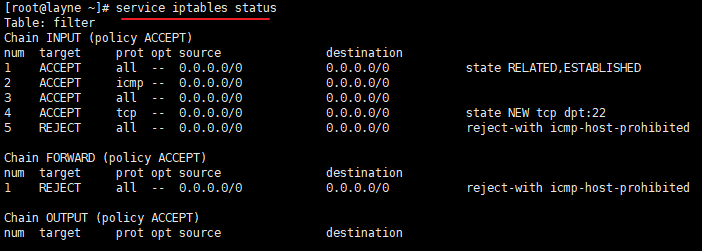 现在我们只是禁止了开机启动,并没有关闭当前运行的防火墙服务,可以输入service iptables status查看防火墙的状态: