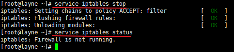 可以看到,防火墙还在运行状态,输入命令service iptables stop以关闭防火墙服务: