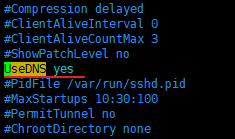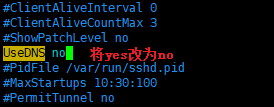在命令行输入vim /etc/ssh/sshd_config ,在vim的命令模式下输入/UseDNS查找UseDNS的位置(可以使用n选择下一个匹配的项目),然后将去掉UseDNS的注释,并将yes改为no,保存退出。