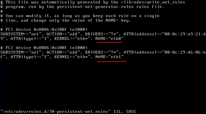 - udev记录网络规则的脚本为:/etc/udev/rules.d/70-persistent-net.rules,当克隆新虚拟机打开该文件后,会发现,里面有eth0,eth1 这两个网卡的信息,但实际上输入