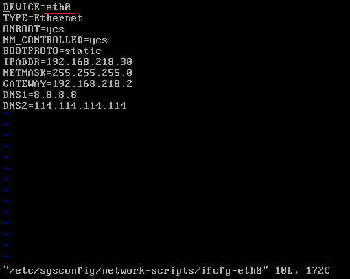 此时,系统使用的是新的网卡eth1,,输入 vi /etc/sysconfig/network-scripts/ifcfg-eth0查看当前虚拟机的网络配置文件,可以发现该虚拟机使用是eth0,如下图所示: