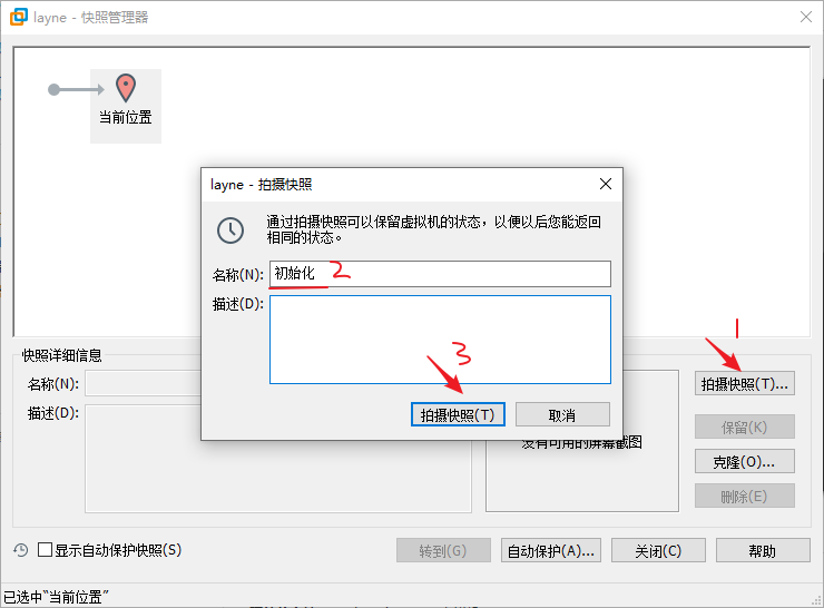(2)点击“拍摄快照”,输入快照名称,再点击弹出框的拍摄快照。