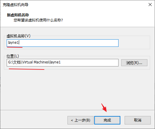 (5)填写克隆的虚拟机名称,选择位置,点击完成。