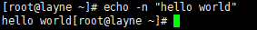 echo $x输出变量xecho "hello"输出字符串echo "hello layne" > log.txt将输出的内容写入到log.txt,如果文件不存在,则会直接创建文件并写入内容。echo "hello layne123456" >> log.txt将输出的内容追加到log.txt。echo -n表示不要另起新行,如输入echo -n "hello world"