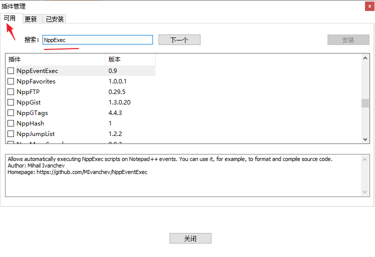 2、在弹出的显示插件的窗口中勾上NppExec这个插件,再点install(因为我这里已经安装完了所以没有显示这个插件出来)