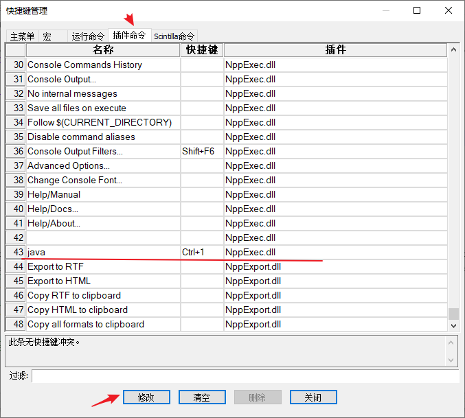 9、点击插件命令,选择java,点击修改,我配置的是ctrl+1有冲突,把有冲突的快捷键清空就行。