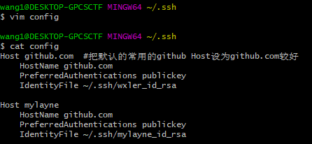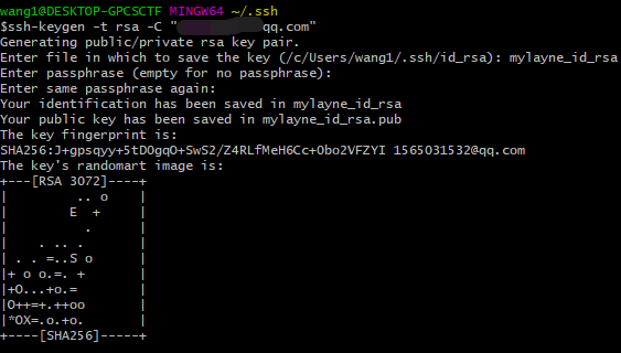- Enter file in which to save the key (/c/Users/wang1/.ssh/id_rsa):提示你把新生成的id_rsa存放到哪里,此处默认会存放在C盘的用户名下的.ssh文件夹下(即你第一个github用户ssh key存放的目录)。这里我只填写了公钥和秘钥文件的名称,所以会在c/Users/wang1/.ssh/目录下生成两个文件:mylayne_id_rsa(秘钥文件)和mylayne_id_rsa.pub(公钥文件)。
