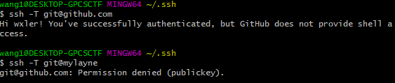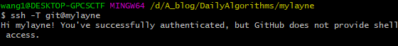 出现如图的欢迎语则为配置成功。但是,执行ssh -T git@mylayne出现 permission denied 的错误。