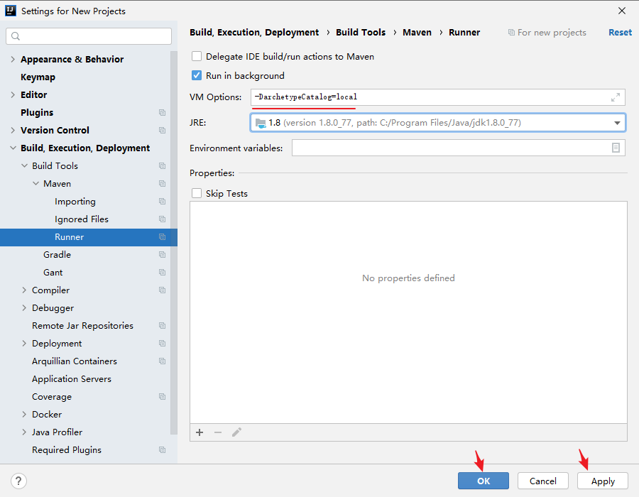 (1)点击菜单->File->Other Settings->Default Settings->Build,Execution,Deploy->Build Tools->Maven->Runner->VM Options 输入: