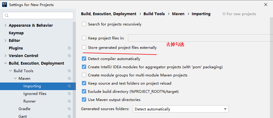 file->setting->build,exevution,development->maven->import 有个配置Store generated project files externally (在外部存储生成的项目文件)选中后,将不会在.idea目录中生成.iml文件和library文件。不选中将会生成。试了一下果然如此(很开心。。)