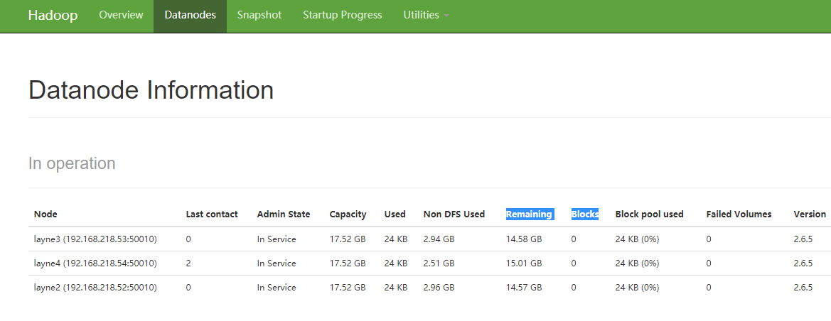 访问:http://layne1:50070,点击DataNodes一栏,会出现如下界面: