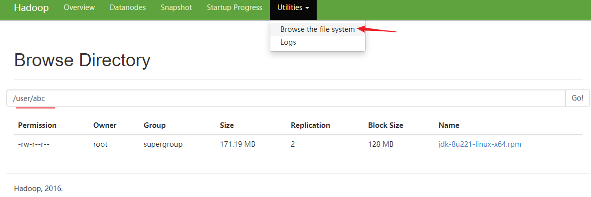 上述命令将文件jdk-8u221-linux-x64.rpm上传到hadoop的/user/abc目录下,注意该目录不是Linux系统中的目录,这两者没关系。
