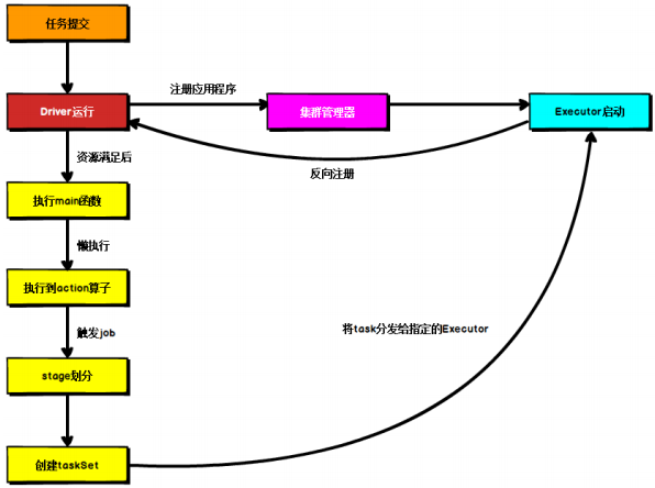 - 之后执行到 Action 算子时,触发一个 Job,并根据宽依赖开始划分 stage,每个 stage 生成对应的 TaskSet,之后将 task 分发到各个 Executor 上执行。