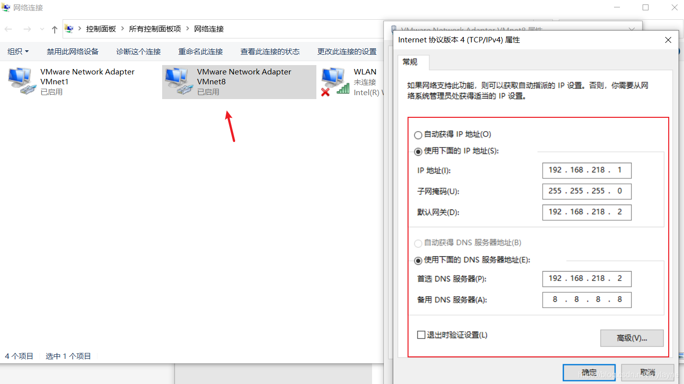 (17)设置VMnet8的ip如下,主机要和上面子网的网络号保持一致