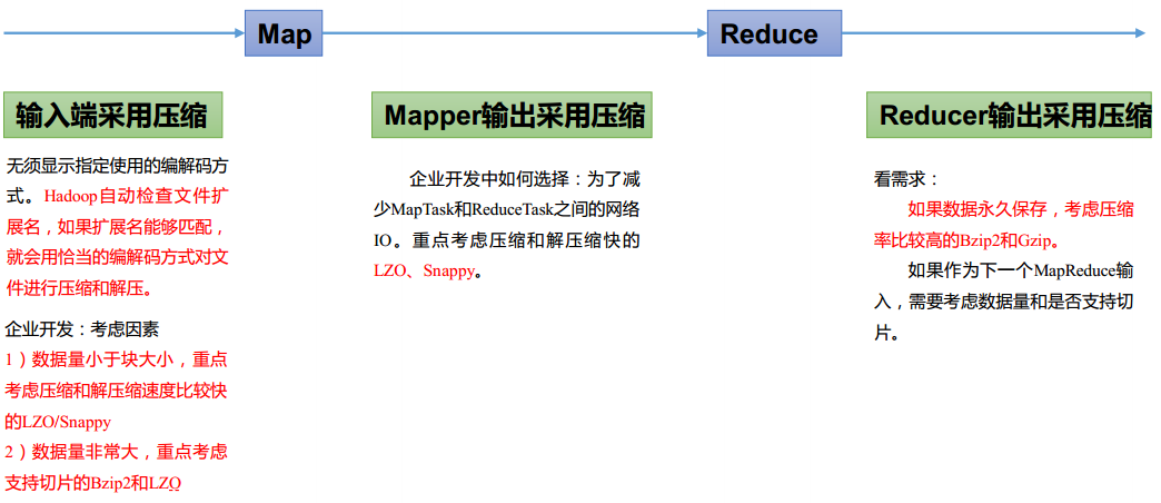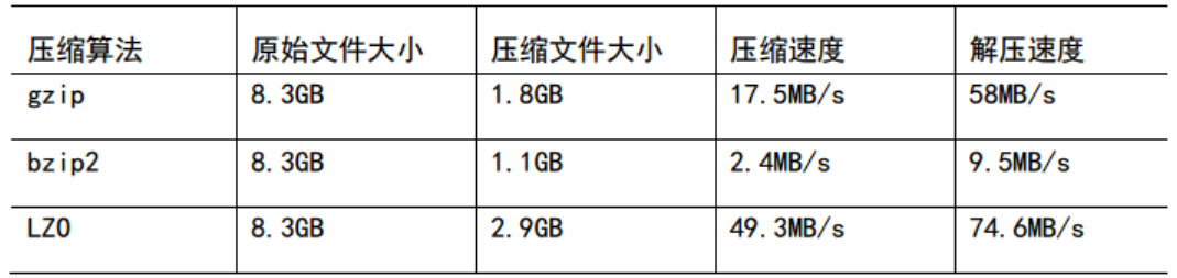 压缩方式选择时重点考虑: 压缩/解压缩速度、压缩率(压缩后存储大小)、压缩后是否可以支持切片。