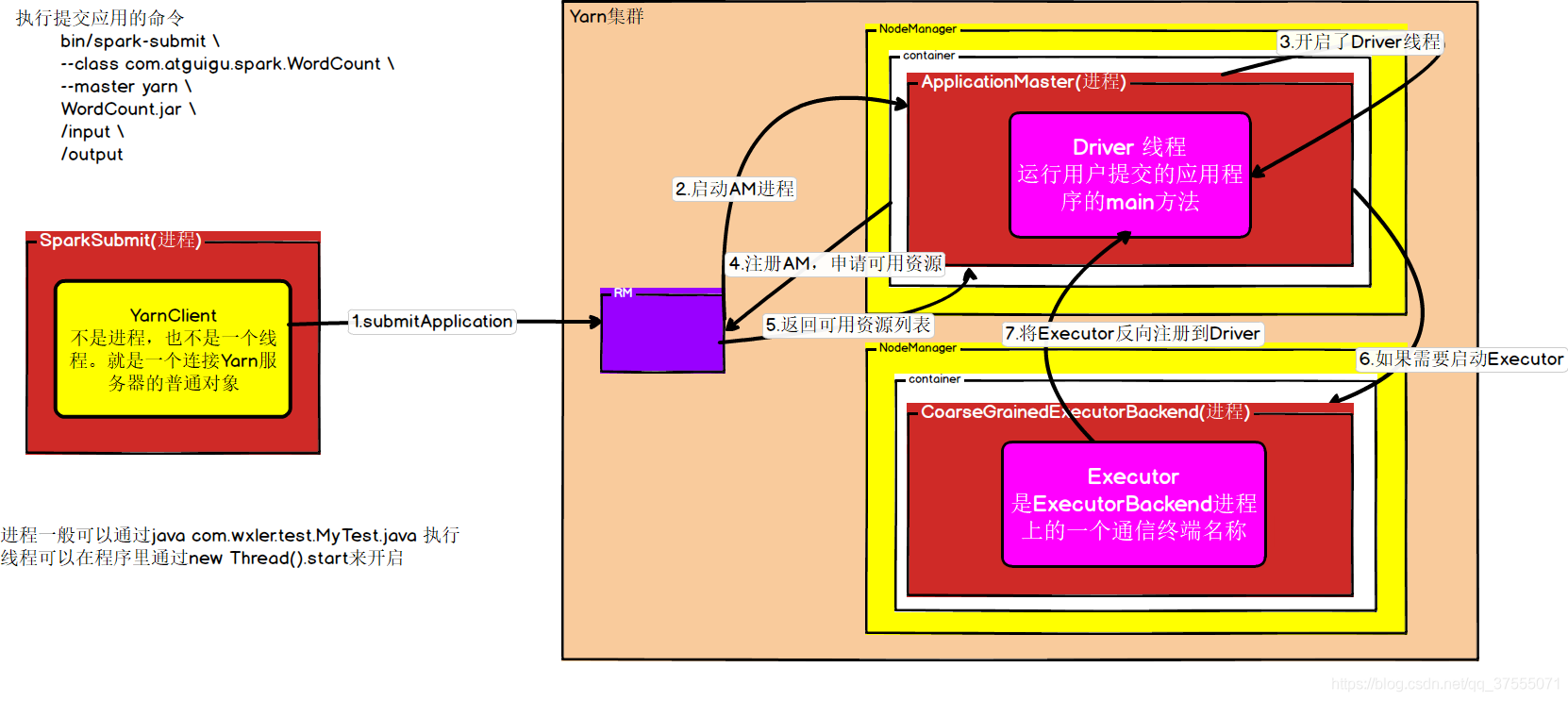 1 2 3 4 5 6 7 8 9 10 11 12 13 14 15 16 17 18 19 20 21 22 23 24 25 26 27 28 29 30 31 32 -main方法 //对参数参数进行封装 *val amArgs = new ApplicationMasterArguments(args) // master里维护了AMRMClient *master = new ApplicationMaster(amArgs, new YarnRMClient) *master.run() >runDriver(securityMgr) &userClassThread = startUserApplication() //userClass即WordCount ~mainMethod = userClassLoader.loadClass(args.userClass).getMethod("main") //开启driver线程 ~userThread = new Thread #mainMethod.invoke ®isterAM() //client(AM)注册到RM上,申请可用资源 ~allocator=client.register //分配资源 ~allocator.allocateResources() //获取需要多少资源 +val allocatedContainers = allocateResponse.getAllocatedContainers() //分配资源(也有最近距离原则和机架感知) + handleAllocatedContainers(allocatedContainers) @runAllocatedContainers(containersToUse) //判断是否需要启动Executor >if (numExecutorsRunning < targetNumExecutors) >ExecutorRunnable.run >startContainer() >prepareCommand() >bin/java org.apache.spark.executor.CoarseGrainedExecutorBackend (粗粒度的Executor) //注意这里的join,阻塞主线程 &userClassThread.join()